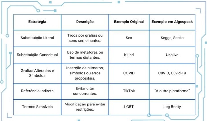 O termo Algospeak refere-se a um tipo de linguagem codificada que usuários de redes sociais empregam para mascarar ou alterar palavras e expressões que, se escritas em sua forma original, seriam detectadas e punidas pelos algoritmos de moderação das plataformas.